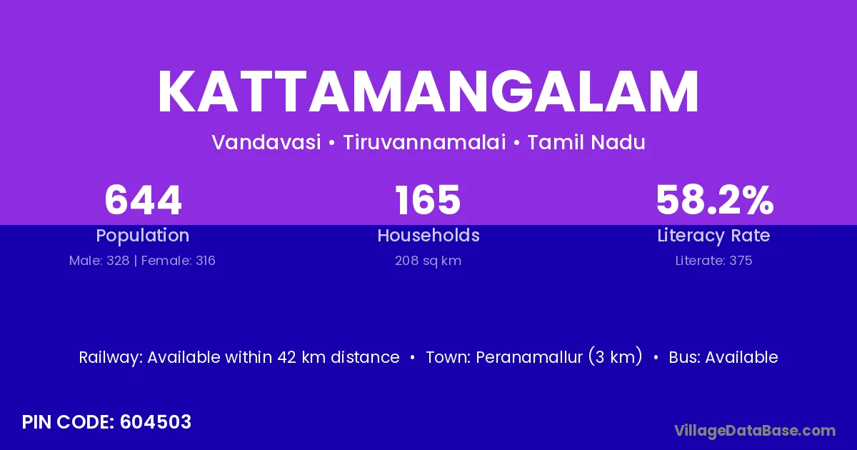 Kattamangalam village has a total population of 644 people, of which 328 are males and 316 are females.