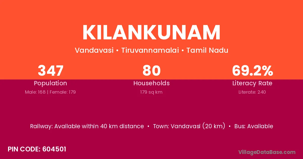 Kilankunam village has a total population of 347 people, of which 168 are males and 179 are females.