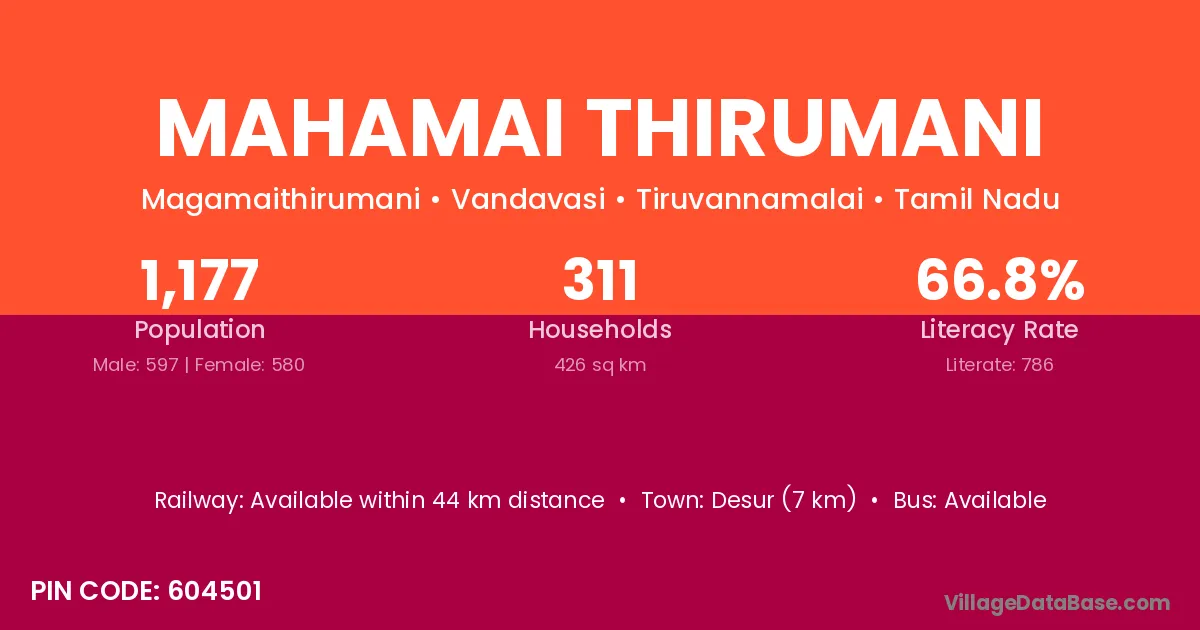 Mahamai Thirumani village has a total population of 1,177 people, of which 597 are males and 580 are females.