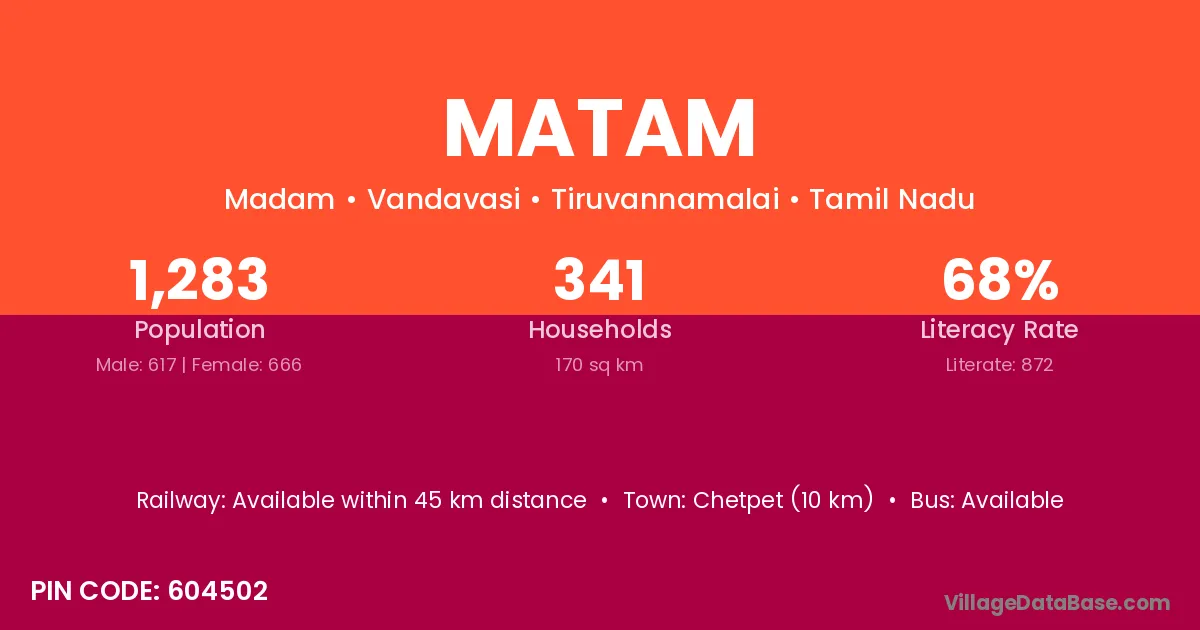 Chetpet (10 km) is the nearest town to Matam village for major economic activities and is located approximately 10 km away.