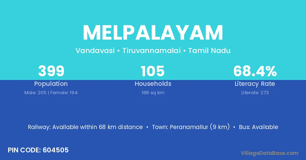 Melpalayam village has a total population of 399 people, of which 205 are males and 194 are females.