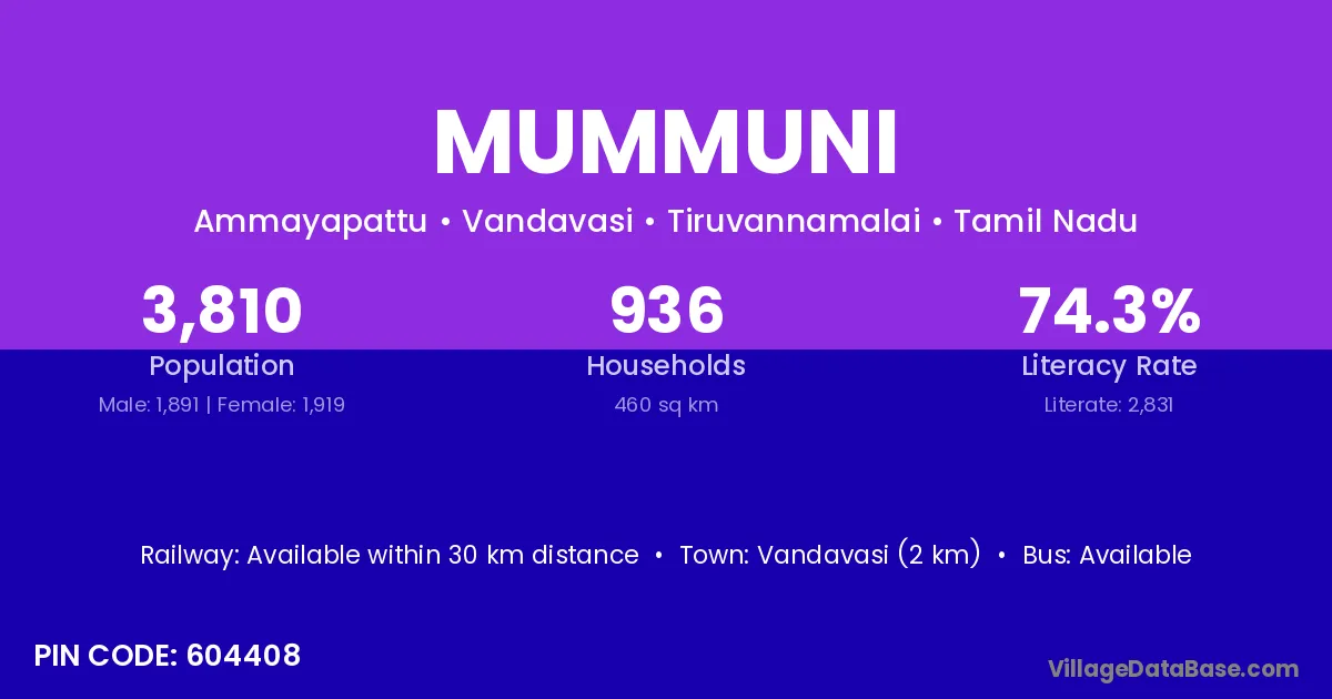 Vandavasi (2 km) is the nearest town to Mummuni village for major economic activities and is located approximately 2 km away.