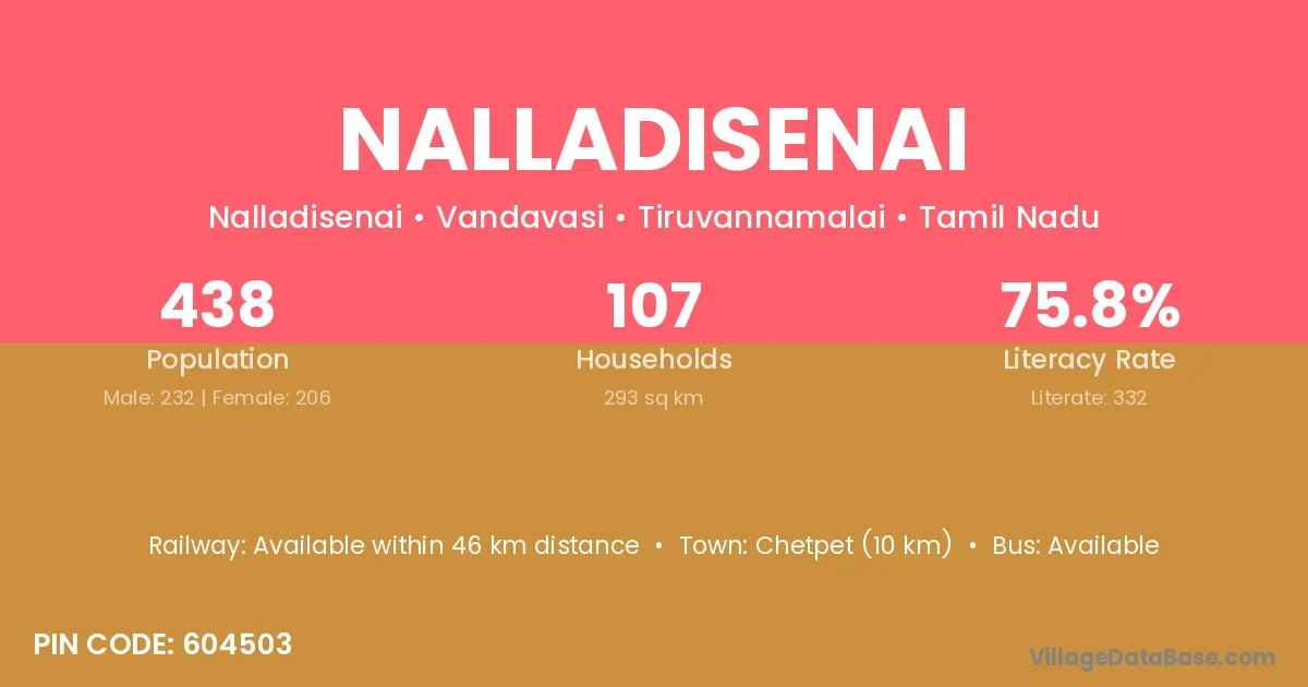 Nalladisenai village has a total population of 438 people, of which 232 are males and 206 are females.