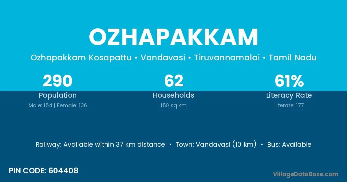 Ozhapakkam village has a total population of 290 people, of which 154 are males and 136 are females.