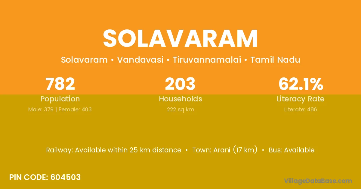 Arani (17 km) is the nearest town to Solavaram village for major economic activities and is located approximately 17 km away.