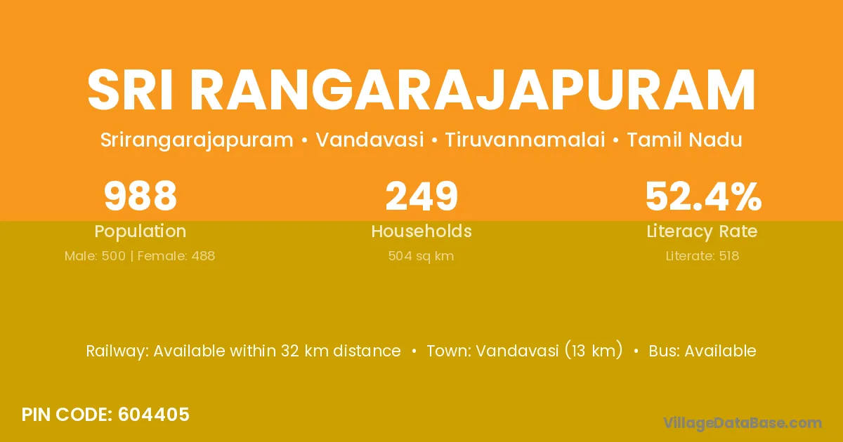 Sri Rangarajapuram village has a total population of 988 people, of which 500 are males and 488 are females.