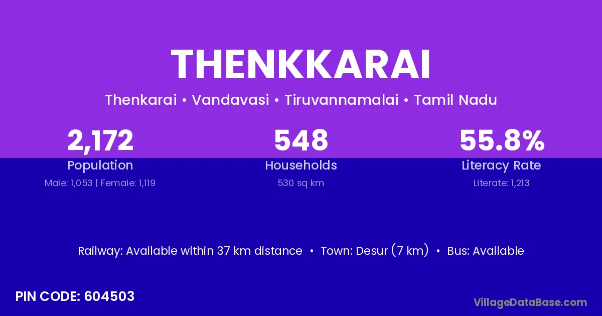 Desur (7 km) is the nearest town to Thenkkarai village for major economic activities and is located approximately 7 km away.