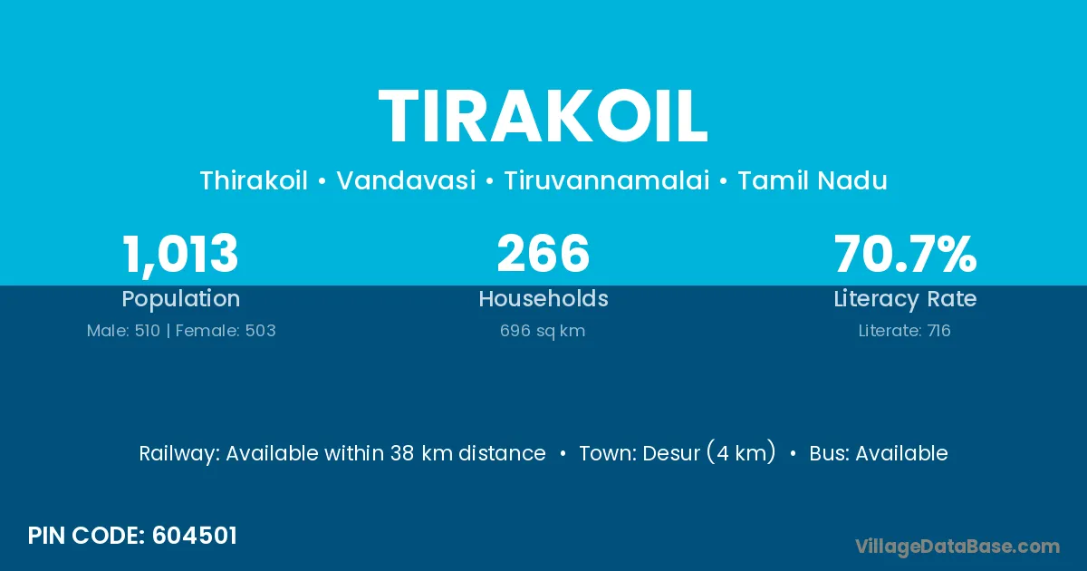 Desur (4 km) is the nearest town to Tirakoil village for major economic activities and is located approximately 4 km away.