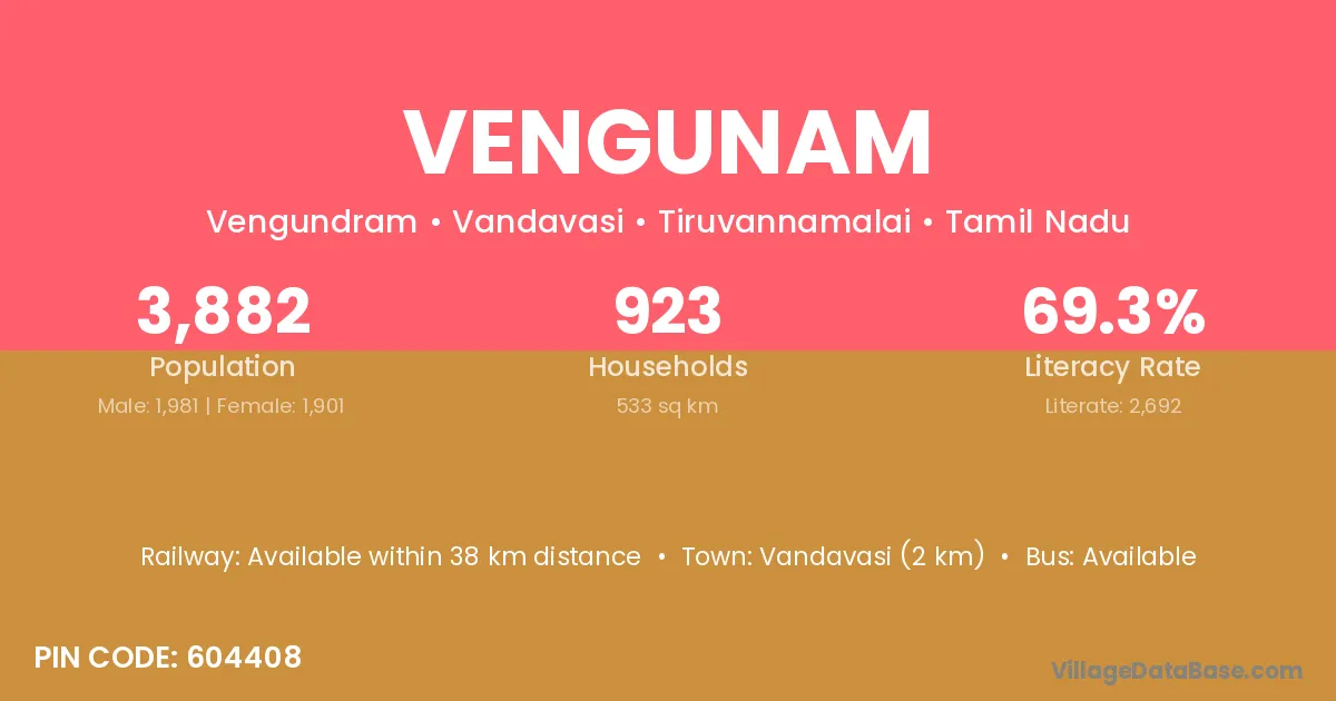 Vandavasi (2 km) is the nearest town to Vengunam village for major economic activities and is located approximately 2 km away.