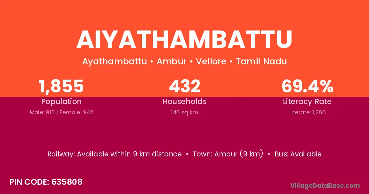 Ambur (9 km) is the nearest town to Aiyathambattu village for major economic activities and is located approximately 9 km away.