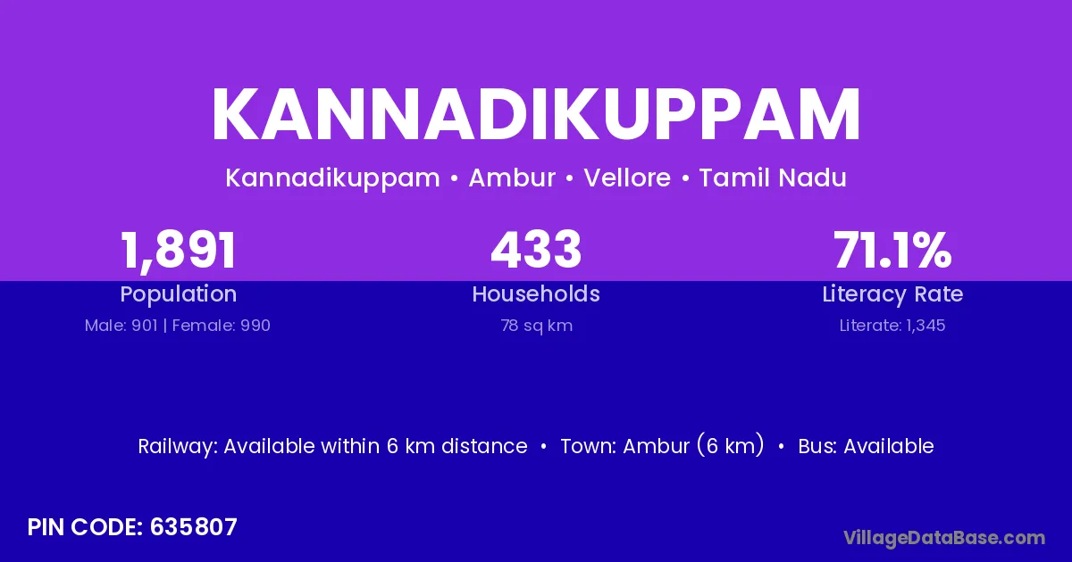 Ambur (6 km) is the nearest town to Kannadikuppam village for major economic activities and is located approximately 6 km away.