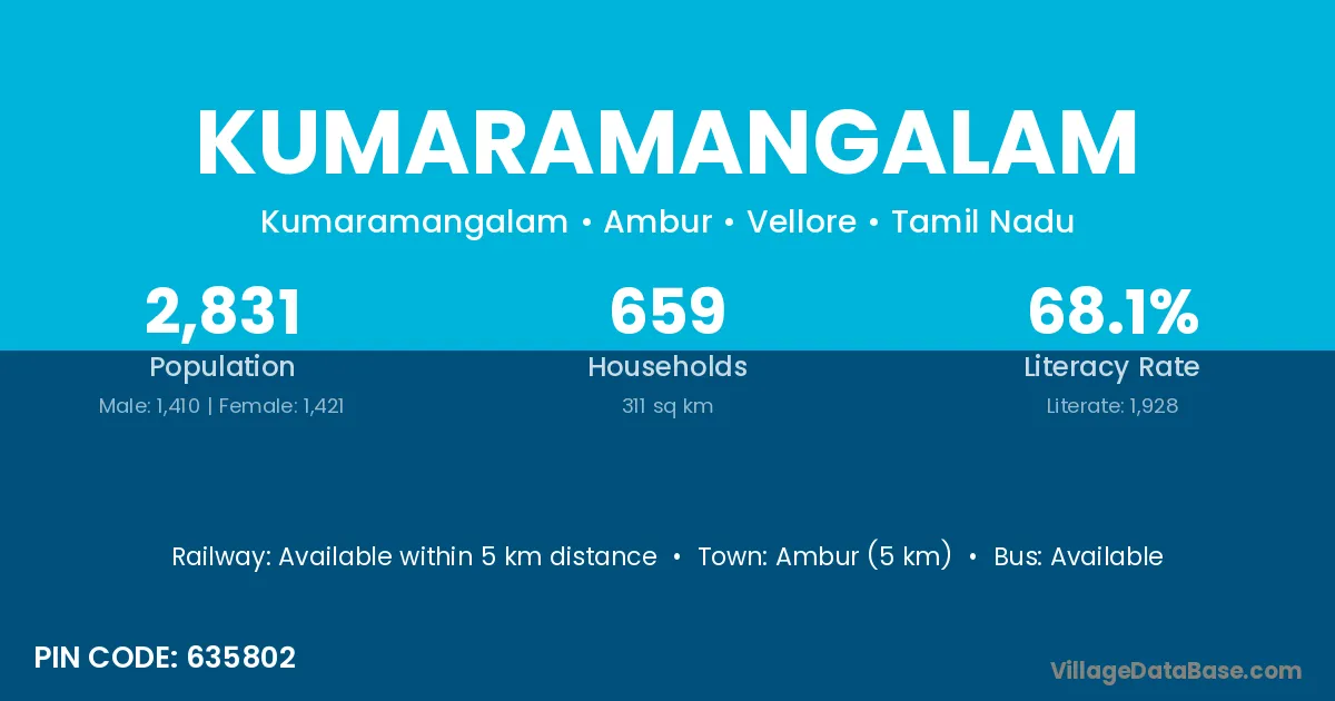 Ambur (5 km) is the nearest town to Kumaramangalam village for major economic activities and is located approximately 5 km away.
