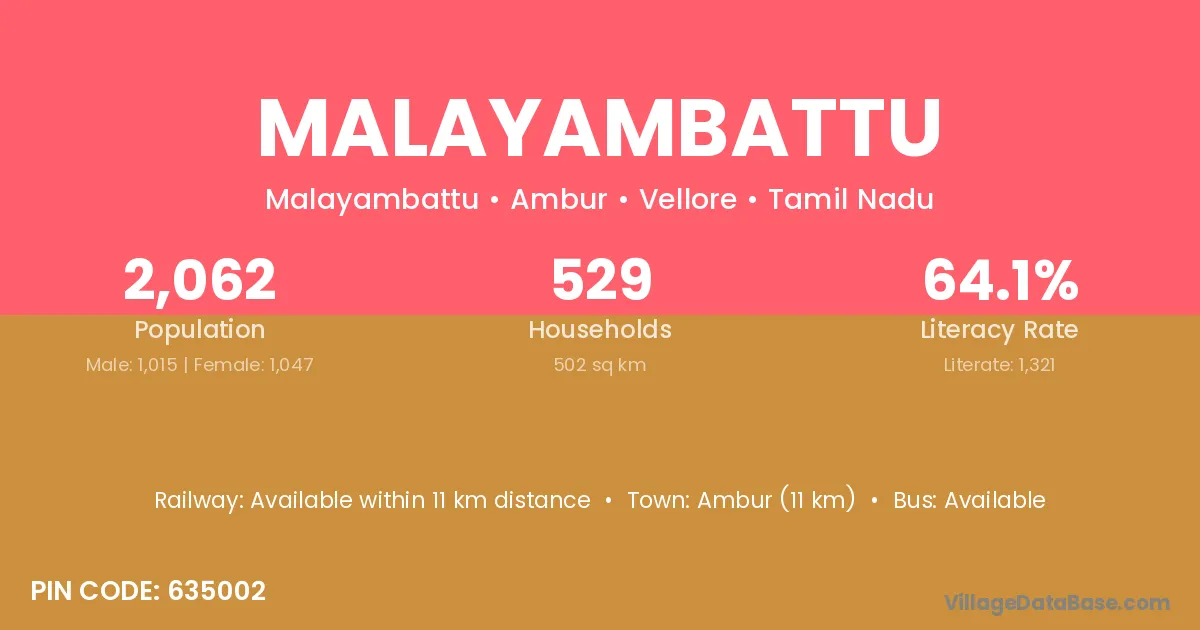 Ambur (11 km) is the nearest town to Malayambattu village for major economic activities and is located approximately 11 km away.