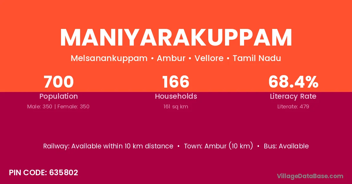 Ambur (10 km) is the nearest town to Maniyarakuppam village for major economic activities and is located approximately 10 km away.