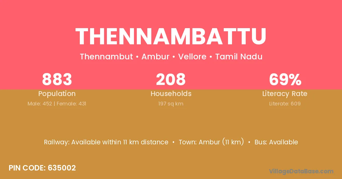 Ambur (11 km) is the nearest town to Thennambattu village for major economic activities and is located approximately 11 km away.