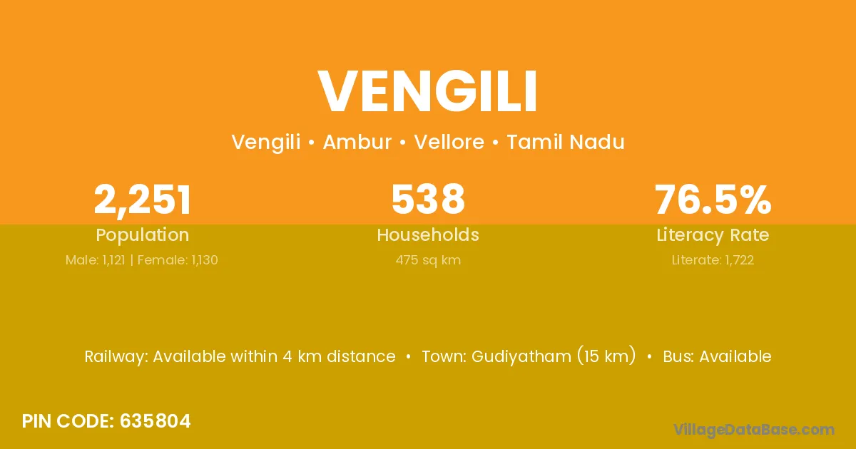 Gudiyatham (15 km) is the nearest town to Vengili village for major economic activities and is located approximately 15 km away.