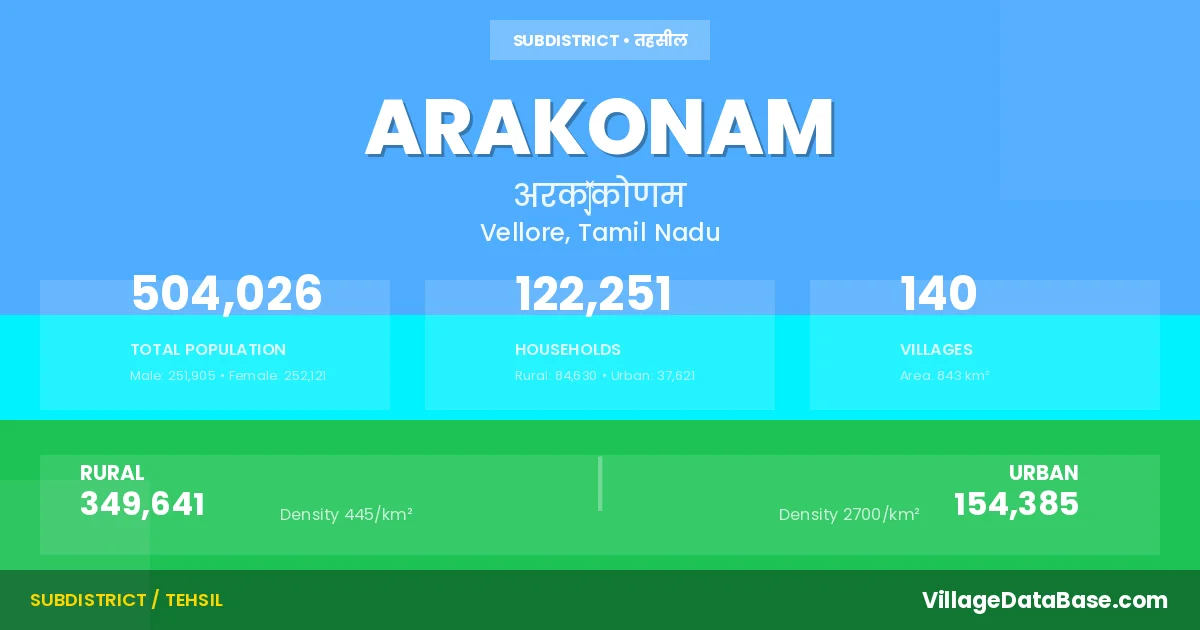 According to the 2011 census The total area of Arakonam Taluka is 843 km², with a population of 504026 people. The population density is 598 inhabitants per square kilometre, and there are approximately 122251 houses in the sub district.