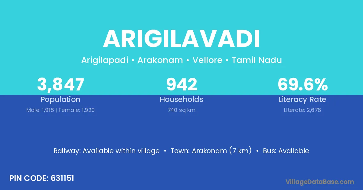 Arakonam (7 km) is the nearest town to Arigilavadi village for major economic activities and is located approximately 7 km away.