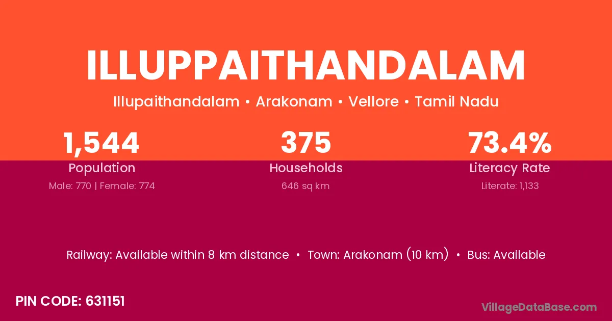 Arakonam (10 km) is the nearest town to Illuppaithandalam village for major economic activities and is located approximately 10 km away.