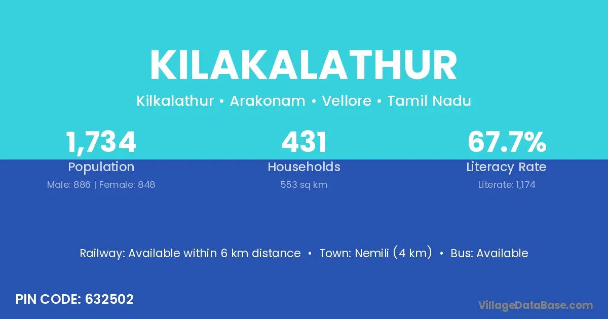 Nemili (4 km) is the nearest town to Kilakalathur village for major economic activities and is located approximately 4 km away.