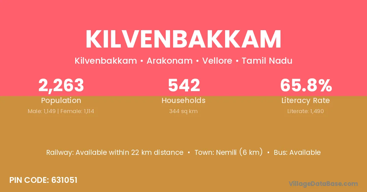 Nemili (6 km) is the nearest town to Kilvenbakkam village for major economic activities and is located approximately 6 km away.