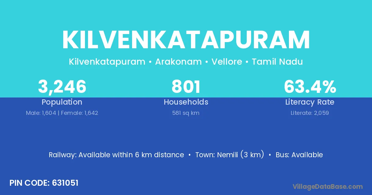 Nemili (3 km) is the nearest town to Kilvenkatapuram village for major economic activities and is located approximately 3 km away.