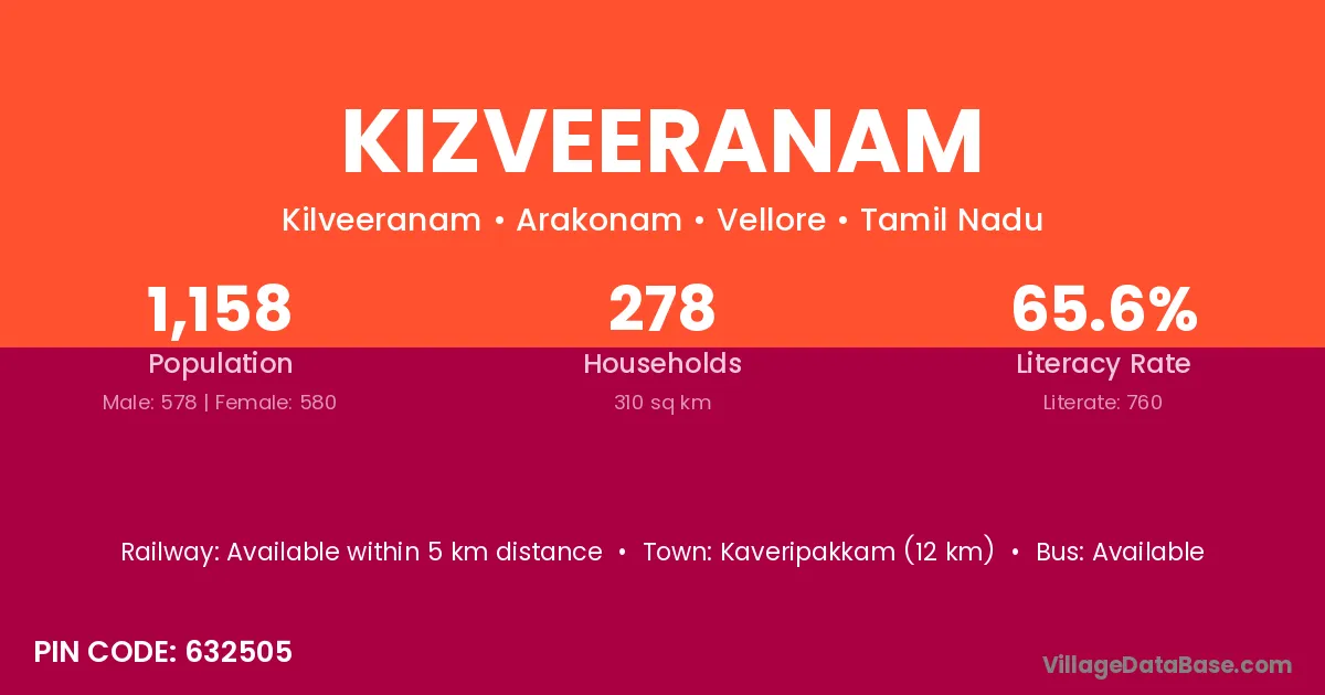 Kizveeranam village has a total population of 1,158 people, of which 578 are males and 580 are females.