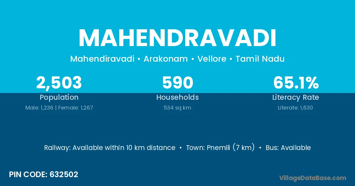 Pnemili (7 km) is the nearest town to Mahendravadi village for major economic activities and is located approximately 7 km away.