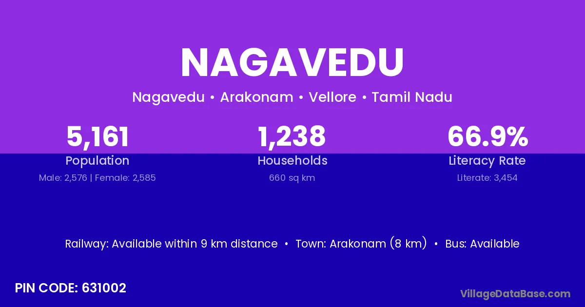 Arakonam (8 km) is the nearest town to Nagavedu village for major economic activities and is located approximately 8 km away.