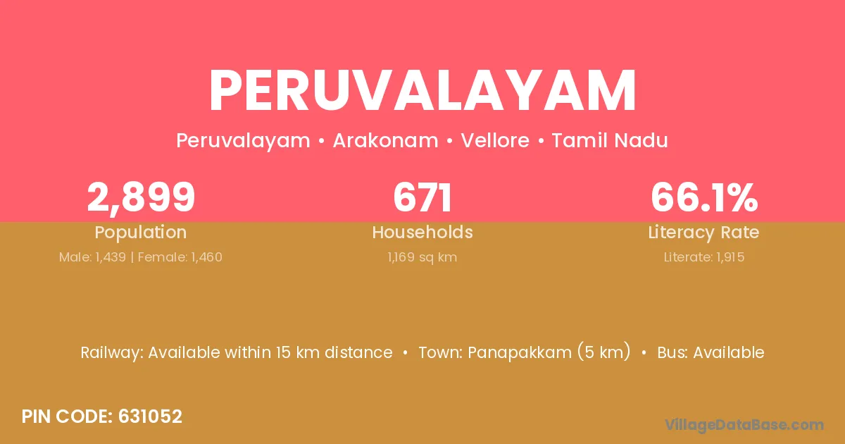 Panapakkam (5 km) is the nearest town to Peruvalayam village for major economic activities and is located approximately 5 km away.