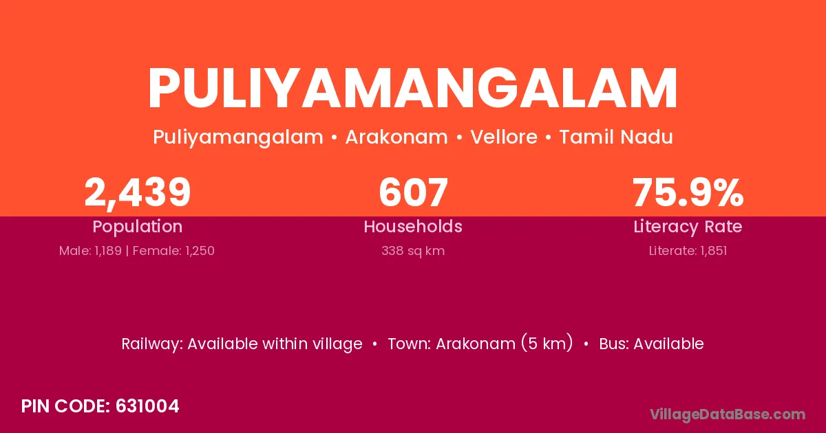 Arakonam (5 km) is the nearest town to Puliyamangalam village for major economic activities and is located approximately 5 km away.
