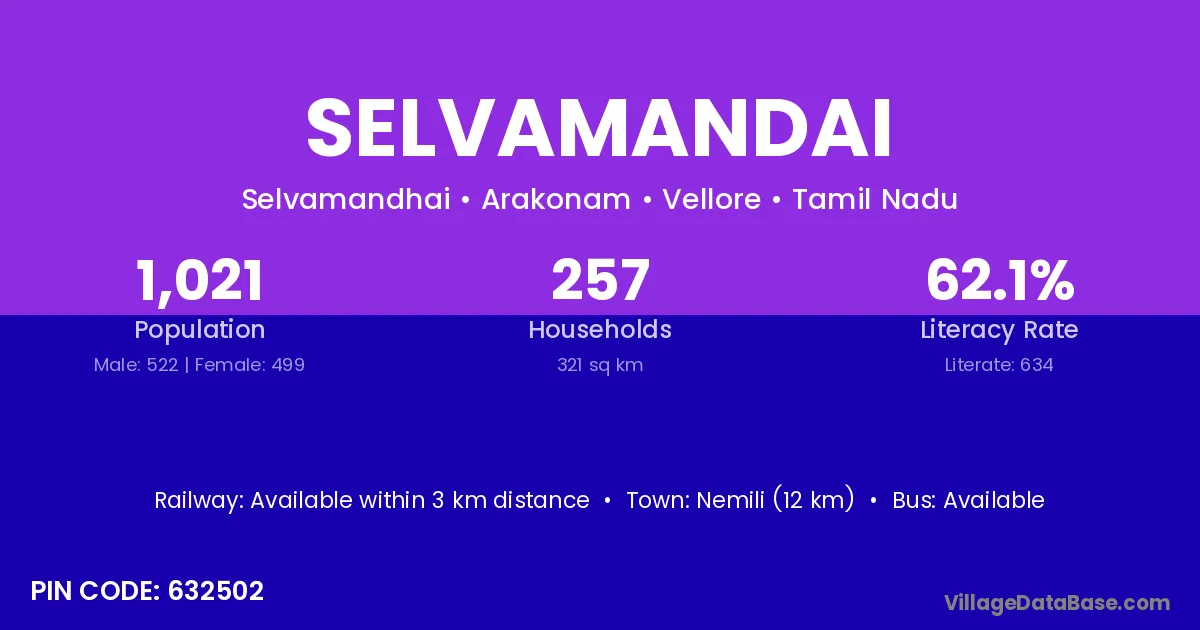 Selvamandai village has a total population of 1,021 people, of which 522 are males and 499 are females.