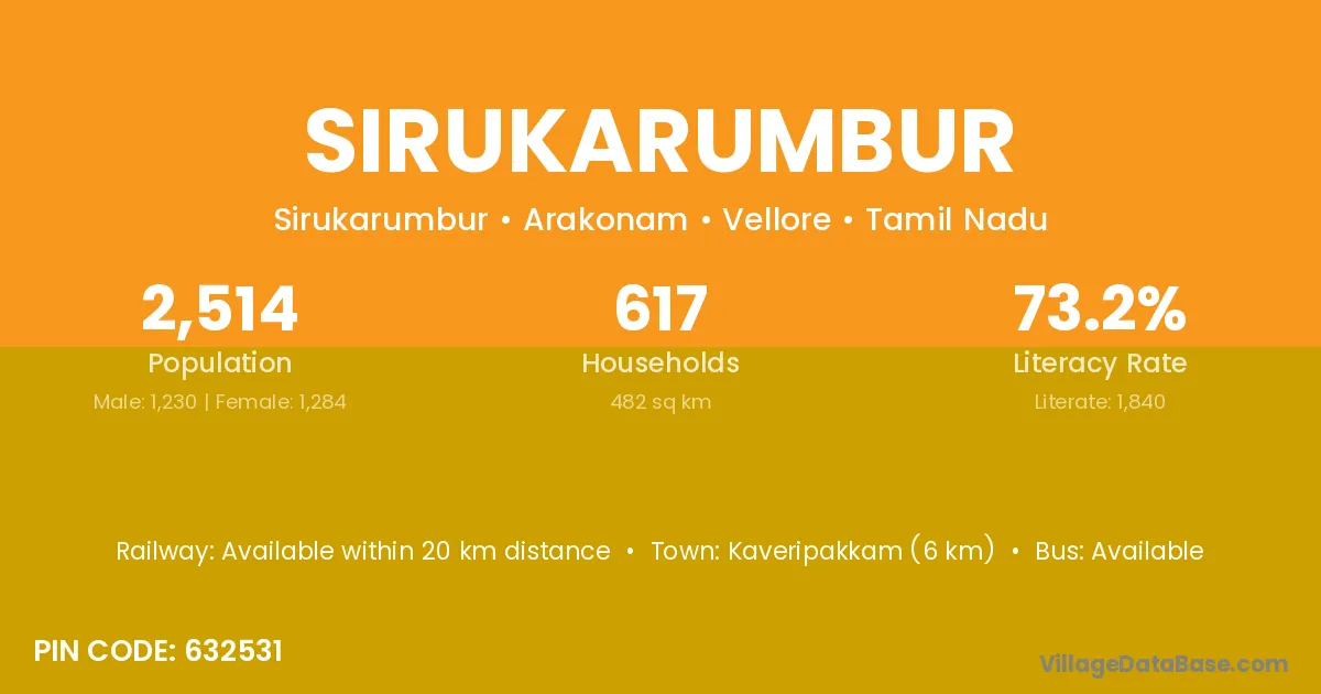 Kaveripakkam (6 km) is the nearest town to Sirukarumbur village for major economic activities and is located approximately 6 km away.