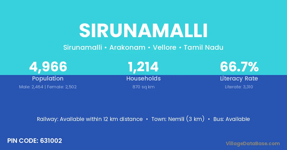 Nemili (3 km) is the nearest town to Sirunamalli village for major economic activities and is located approximately 3 km away.