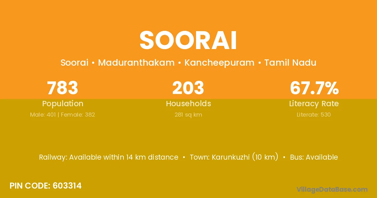 Sholingar (10 km) is the nearest town to Soorai village for major economic activities and is located approximately 10 km away.