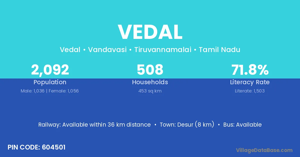 According to Census 2011 information, the village code of Vedal village is 632502.