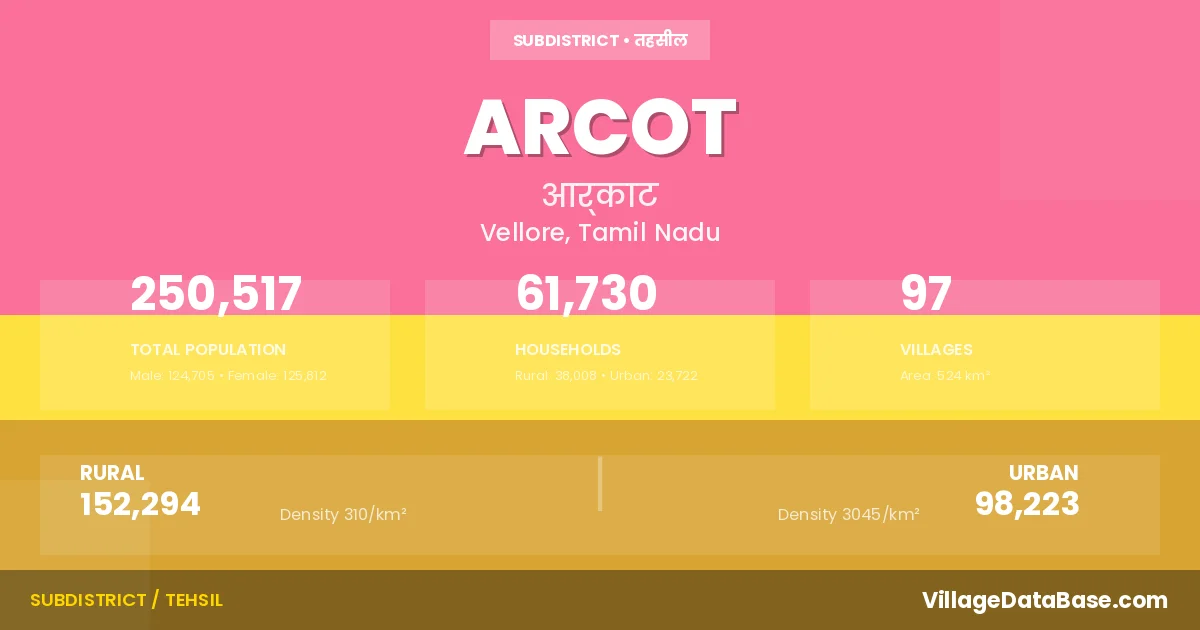 According to the 2011 census The total area of Arcot Taluka is 524 km², with a population of 250517 people. The population density is 478 inhabitants per square kilometre, and there are approximately 61730 houses in the sub district.