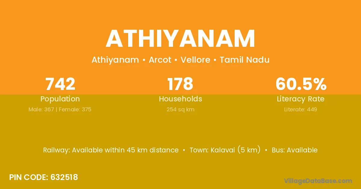 Kalavai (5 km) is the nearest town to Athiyanam village for major economic activities and is located approximately 5 km away.