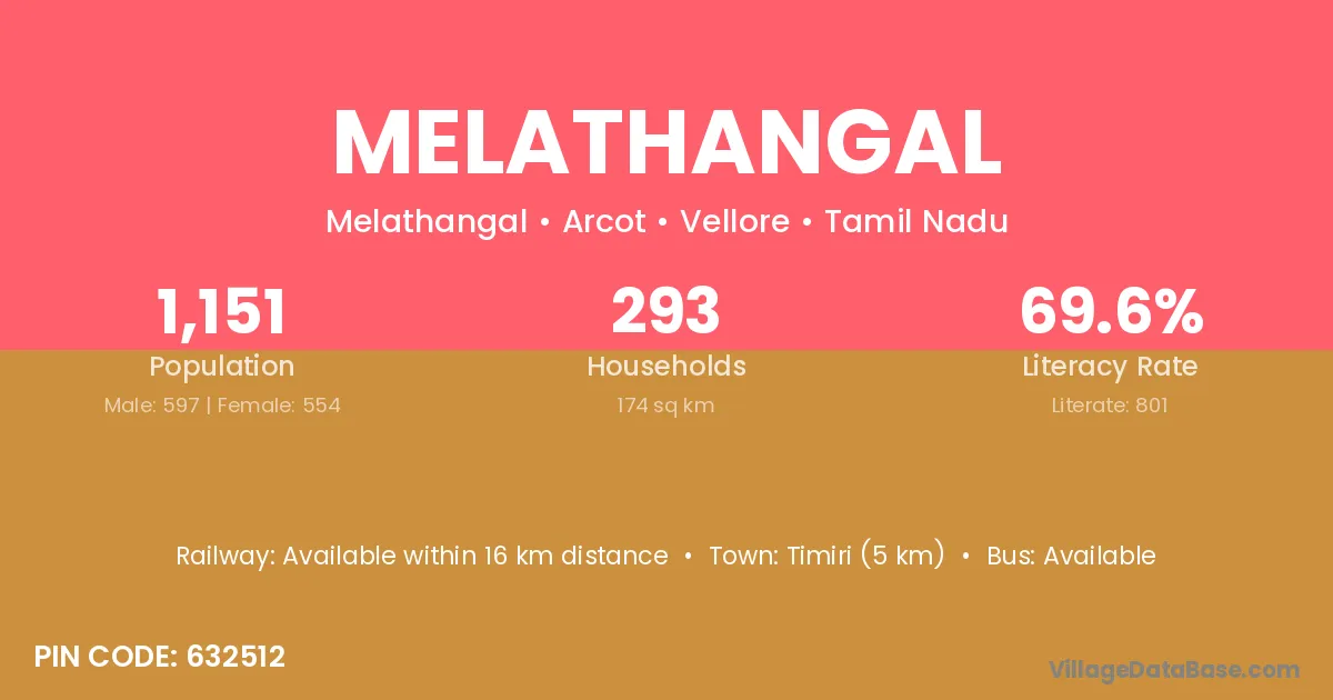 Timiri (5 km) is the nearest town to Melathangal village for major economic activities and is located approximately 5 km away.