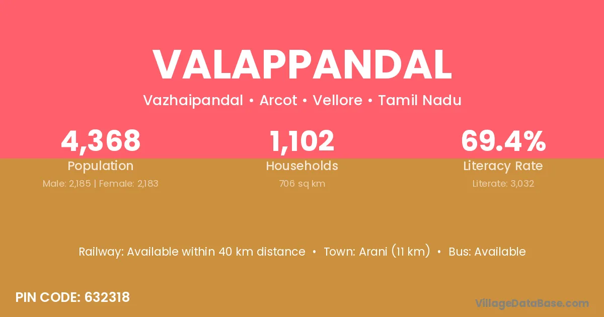 Arani (11 km) is the nearest town to Valappandal village for major economic activities and is located approximately 11 km away.