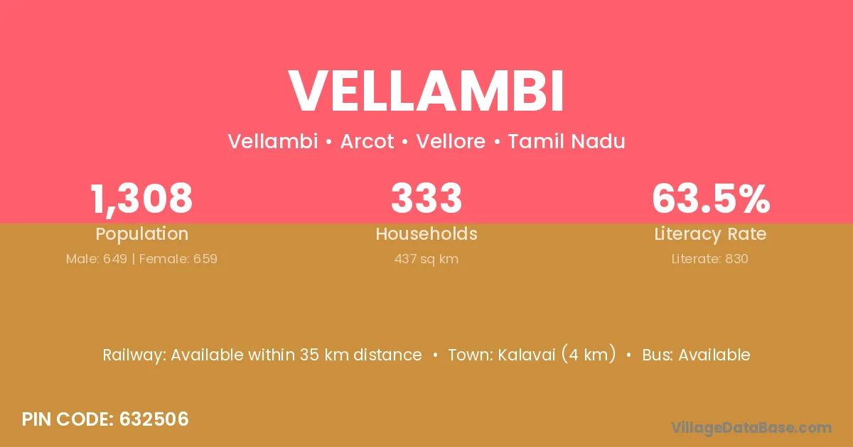 Kalavai (4 km) is the nearest town to Vellambi village for major economic activities and is located approximately 4 km away.