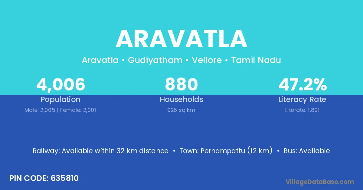 Pernampattu (12 km) is the nearest town to Aravatla village for major economic activities and is located approximately 12 km away.