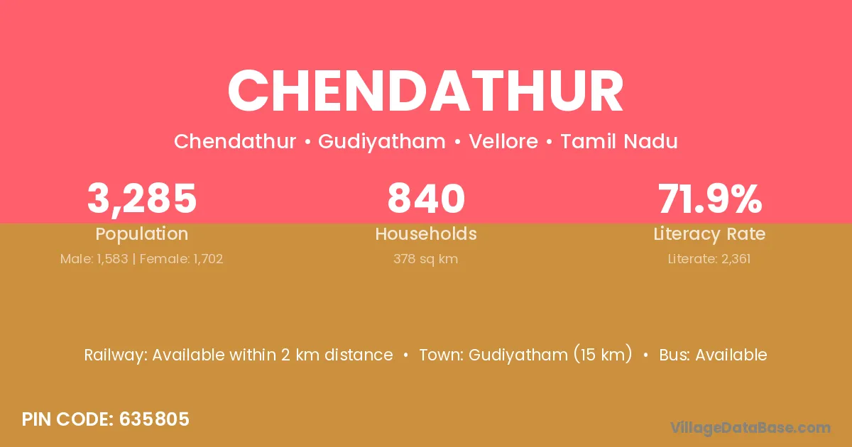 Gudiyatham (15 km) is the nearest town to Chendathur village for major economic activities and is located approximately 15 km away.