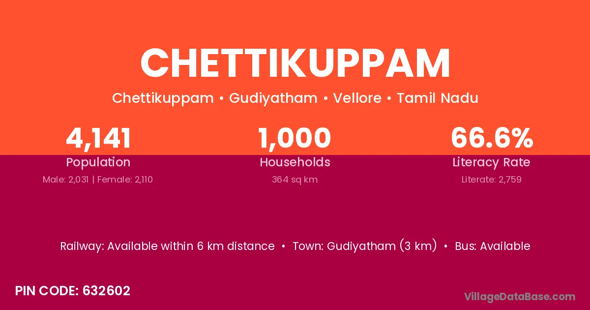 Gudiyatham (3 km) is the nearest town to Chettikuppam village for major economic activities and is located approximately 3 km away.