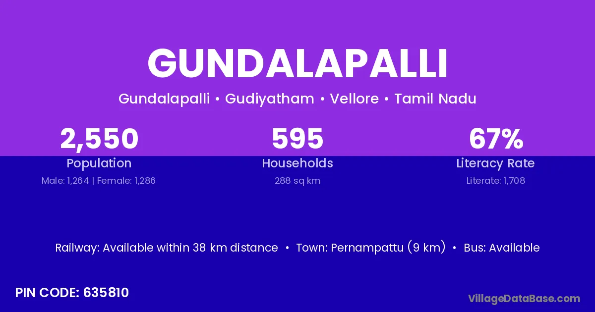 Pernampattu (9 km) is the nearest town to Gundalapalli village for major economic activities and is located approximately 9 km away.