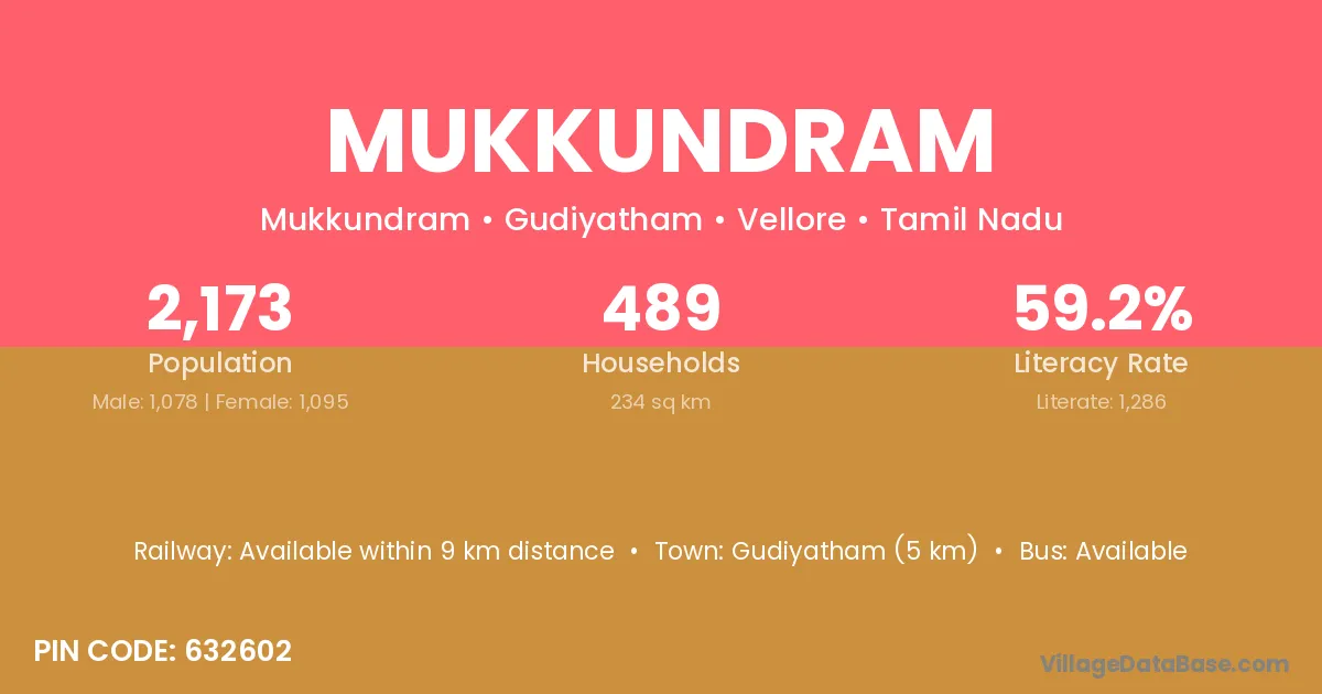 Gudiyatham (5 km) is the nearest town to Mukkundram village for major economic activities and is located approximately 5 km away.