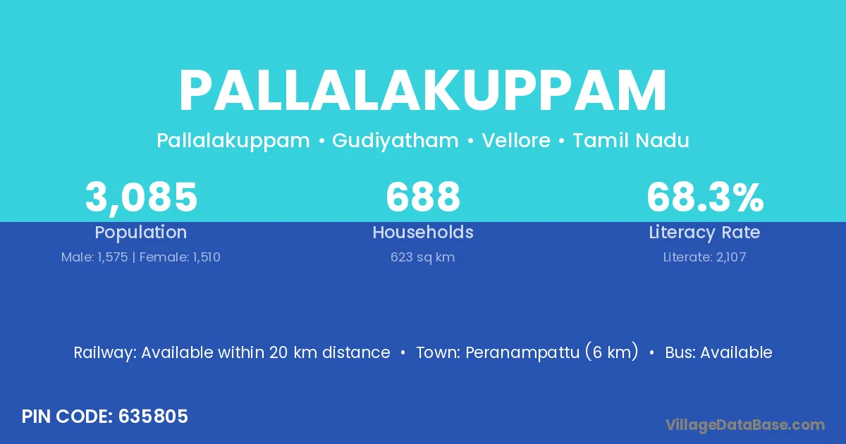 Peranampattu (6 km) is the nearest town to Pallalakuppam village for major economic activities and is located approximately 6 km away.