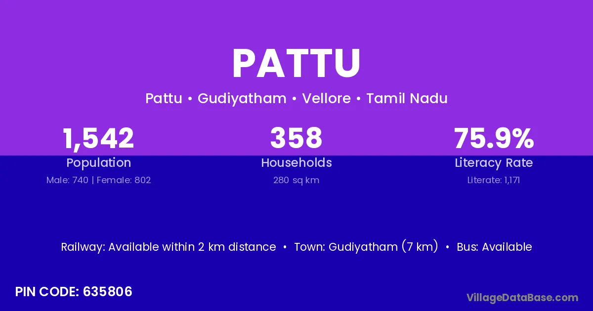Gudiyatham (7 km) is the nearest town to Pattu village for major economic activities and is located approximately 7 km away.
