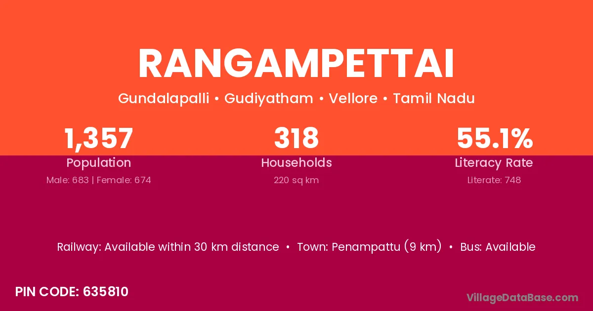 Rangampettai village has a total population of 1,357 people, of which 683 are males and 674 are females.