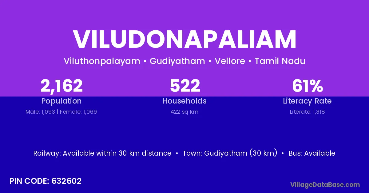 Gudiyatham (30 km) is the nearest town to Viludonapaliam village for major economic activities and is located approximately 30 km away.